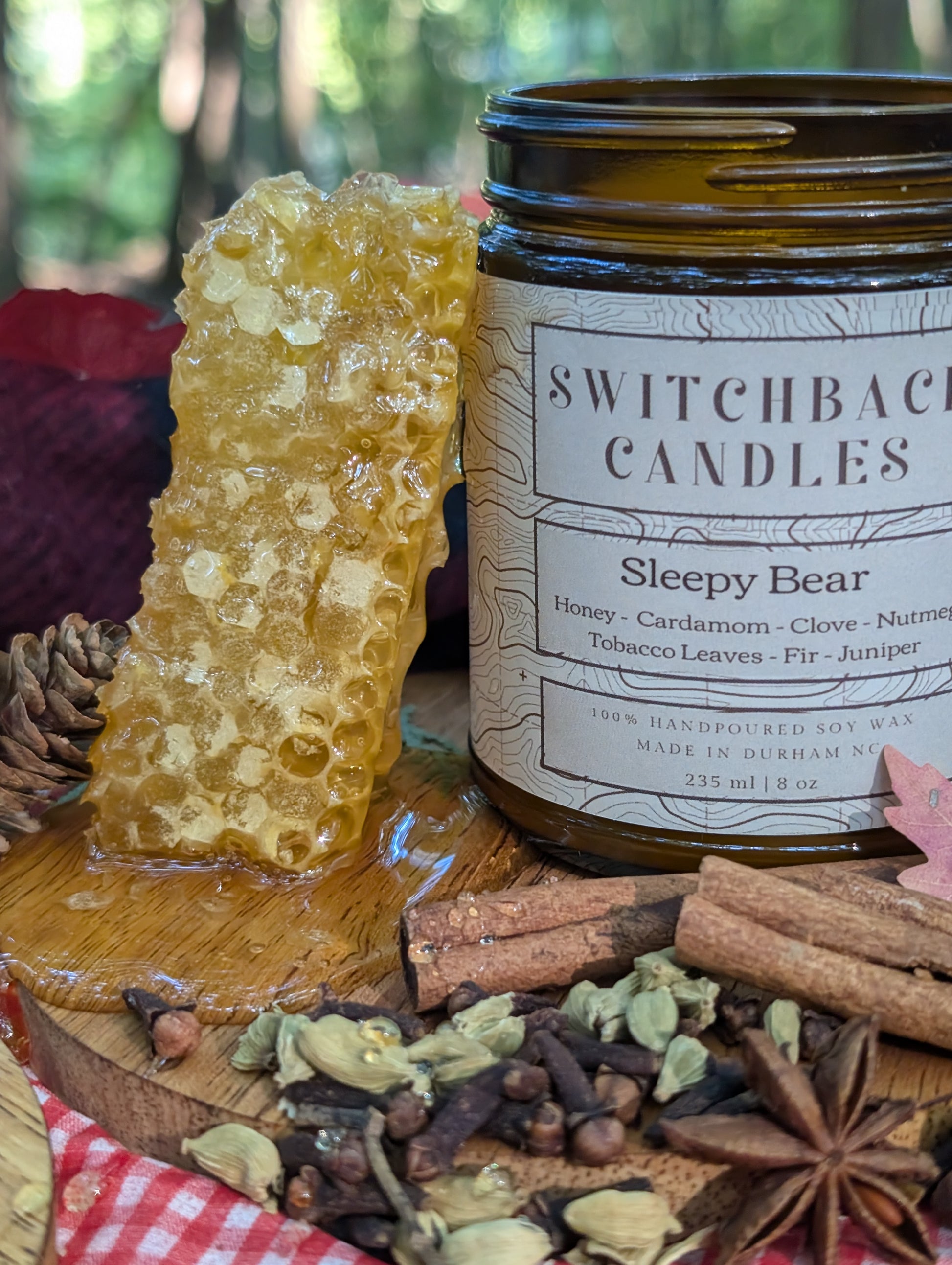 Sleepy Bear - 8 oz 100% soy wax candle, notes of honey, cardamom, clove, tobacco leaves, fir and juniper. A spiced honey dream and a cozy, snuggly way to greet autumn!
